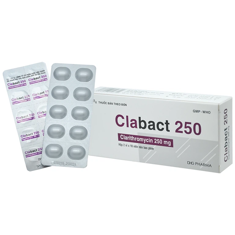 Mô tả ngắn: Thuốc Clabact 250 là viên nén chứa hoạt chất Clarithromycin dùng trong điều trị nhiễm khuẩn đường hô hấp như viêm amidan, viêm tai giữa, viêm xoang cấp, viêm phế quản mạn có đợt cấp, viêm phổi cộng đồng; nhiễm khuẩn da và các mô mềm do vi khuẩn nhạy cảm. Dự phòng và điều trị nhiễm Mycobacterium avium complex (MAC) ở người nhiễm HIV nặng. Dự phòng viêm màng tim nhiễm khuẩn khi dị ứng với penicilin. Phối hợp điều trị trong viêm loét dạ dày – tá tràng do nhiễm Helicobacter pylori.
