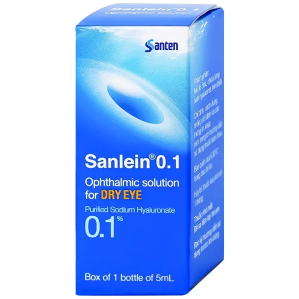 Mô tả ngắn: Sanlein 0.1 là dung dịch nhỏ mắt chứa natri hyaluronate tinh khiết, do Santen Pharmaceutical Co., Ltd. triển khai nhằm mục đích để điều trị thương tổn biểu mô kết – giác mạc. Natri hyaluronate là một chất sinh học, trong các nghiên cứu tiền lâm sàng cho thấy có tác dụng thúc đẩy sự liền sẹo biểu mô giác mạc và có tính chất giữ nước. Chất này hữu dụng về mặt lâm sàng để điều trị thương tổn biểu mô kết – giác mạc liên quan với hội chứng khô mắt hoặc các rối loạn khác.